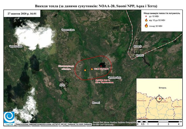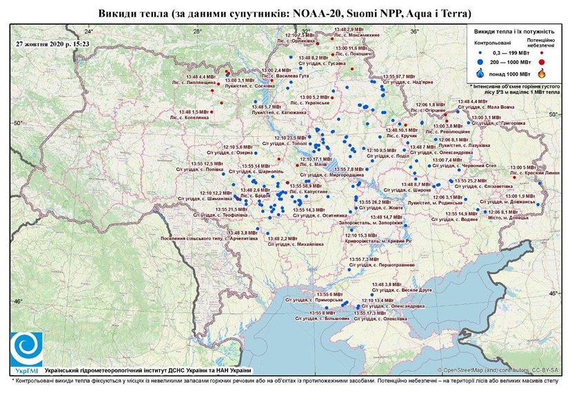 Рис. 1. Карта місць фіксації викидів тепла 27 жовтня 2020 року